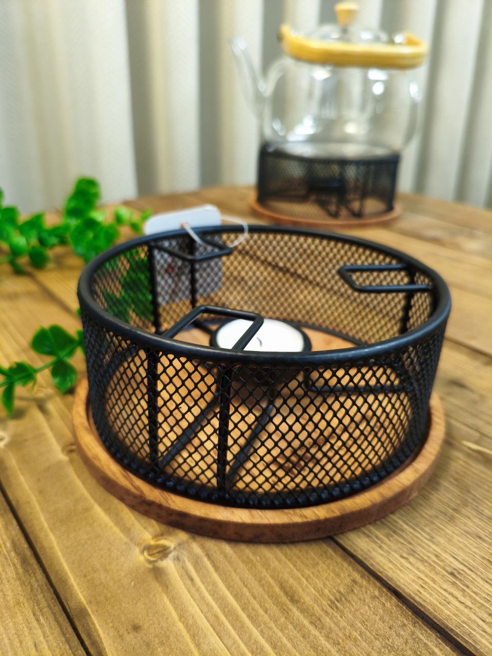 وارمر قوری استیل گرد مشکی، یک اکسسوری شیک و کاربردی برای گرم نگه داشتن چای یا دمنوش در قوریهای شیشهای و پیرکس است. این محصول با طراحی مدرن توری (مش) و رنگ مشکی مات، همراه با پایه چوبی طبیعی، جلوهای زیبا و مینیمال به میز چای یا پذیرایی شما میبخشد. مناسب برای استفاده با شمع وارمر (تیلایت) که در مرکز قرار میگیرد و حرارت ملایمی تولید میکند.