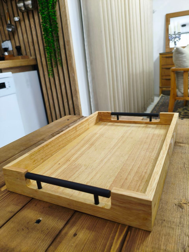 سینی چوبی رابروود با دسته فلزی، یک اکسسوری زیبا، مقاوم و کاربردی برای سرو غذا، صبحانه، چای یا دکوراسیون میز است. این سینی از چوب طبیعی رابروود (Rubberwood) ساخته شده که با رنگ روشن و رگههای طبیعی، ظاهری گرم و مدرن دارد. دستههای فلزی مشکی مات، حمل آسان و جلوهای صنعتی-مینیمال به آن میبخشد.