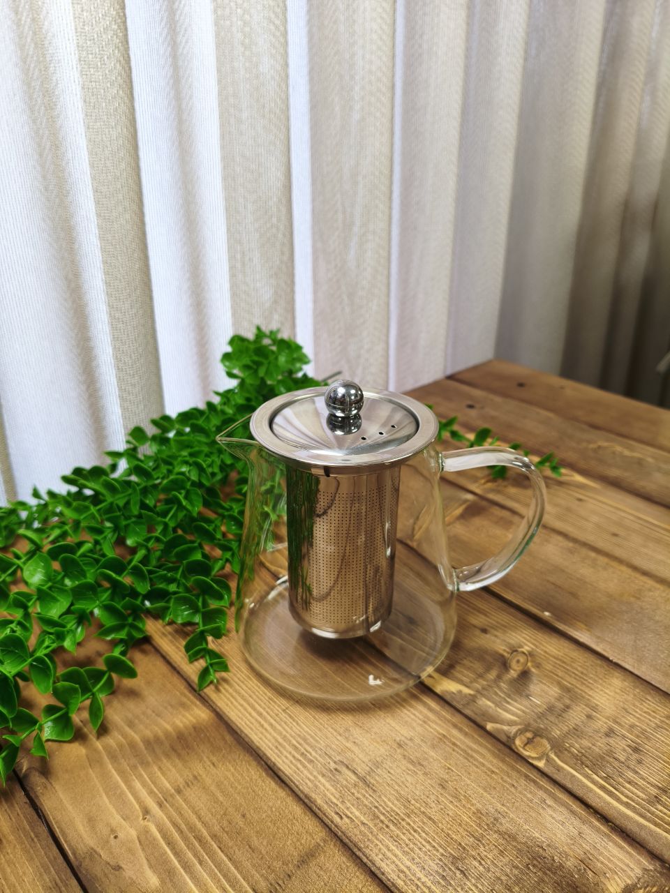 قوری تمام شیشهای بوروسیلیکات (پیرکس) مقاوم حرارتی با طراحی شیک و مدرن، دسته شیشهای یکتکه و درب تمام استیل ضدزنگ همراه با صافی استیل بلند و عمیق. ایدهآل برای دمکردن چای، دمنوشهای گیاهی، چای میوهای و حتی بلومینگ تی (چای گلدار).