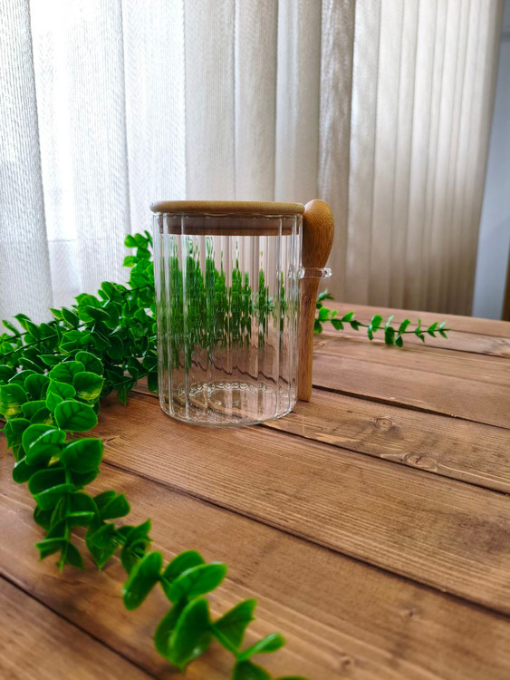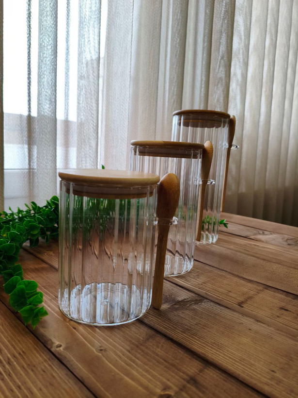 قاشق: هر ظرف همراه با یک قاشق شیشهای کوچک دارد که با حلقه سیلیکونی به درب متصل شده و همیشه در دسترس است.