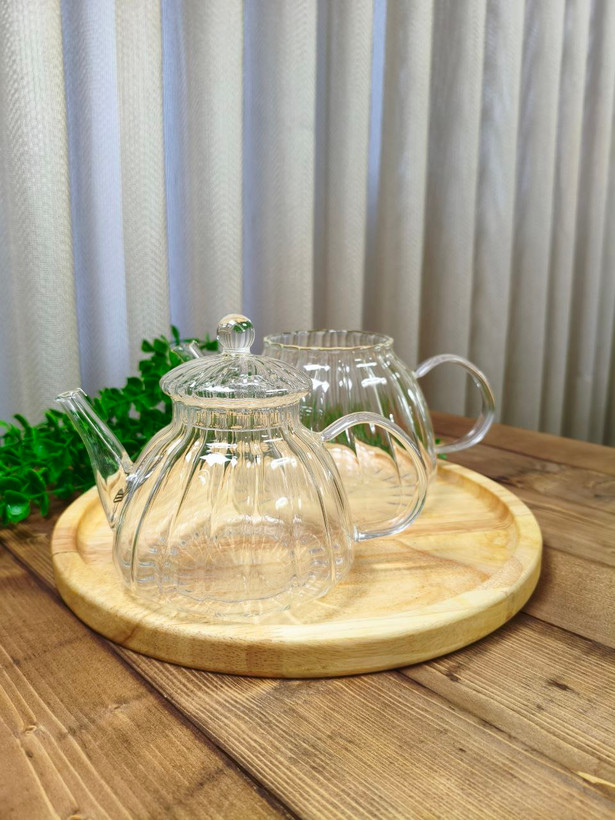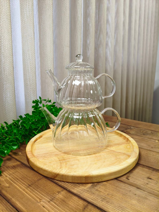 این تصویر یک ست چایساز (چایدمنوش) دو تکه شیشهای بوروسیلیکات (شیشه پیرکس مقاوم به حرارت) با طراحی بسیار زیبا و مینیمال است.