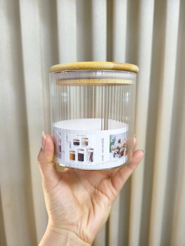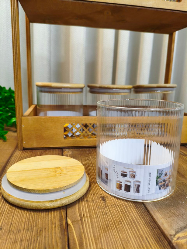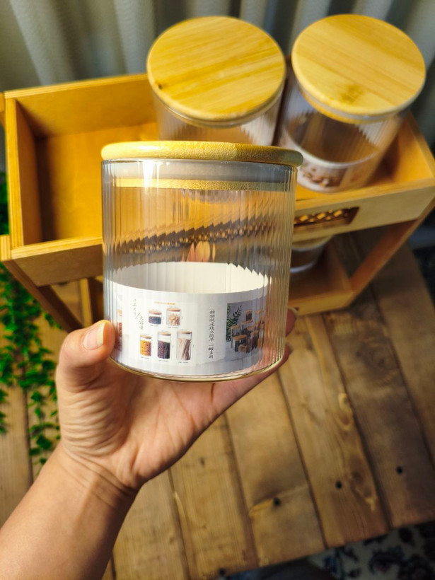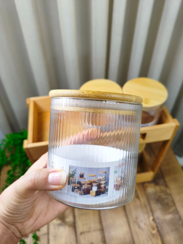 بدنه استوانهای شفاف از شیشه بوروسیلیکات (پیرکس مقاوم)، با شیارهای عمودی ظریف که نور رو به رقص درمیاره و درخششی رویایی ایجاد میکنه. درب چوبی بامبو طبیعی، با واشر سیلیکونی کیپشونده، نه تنها هوا و رطوبت رو بیرون نگه میداره، بلکه حس گرمی چوب رو به دکور میاره